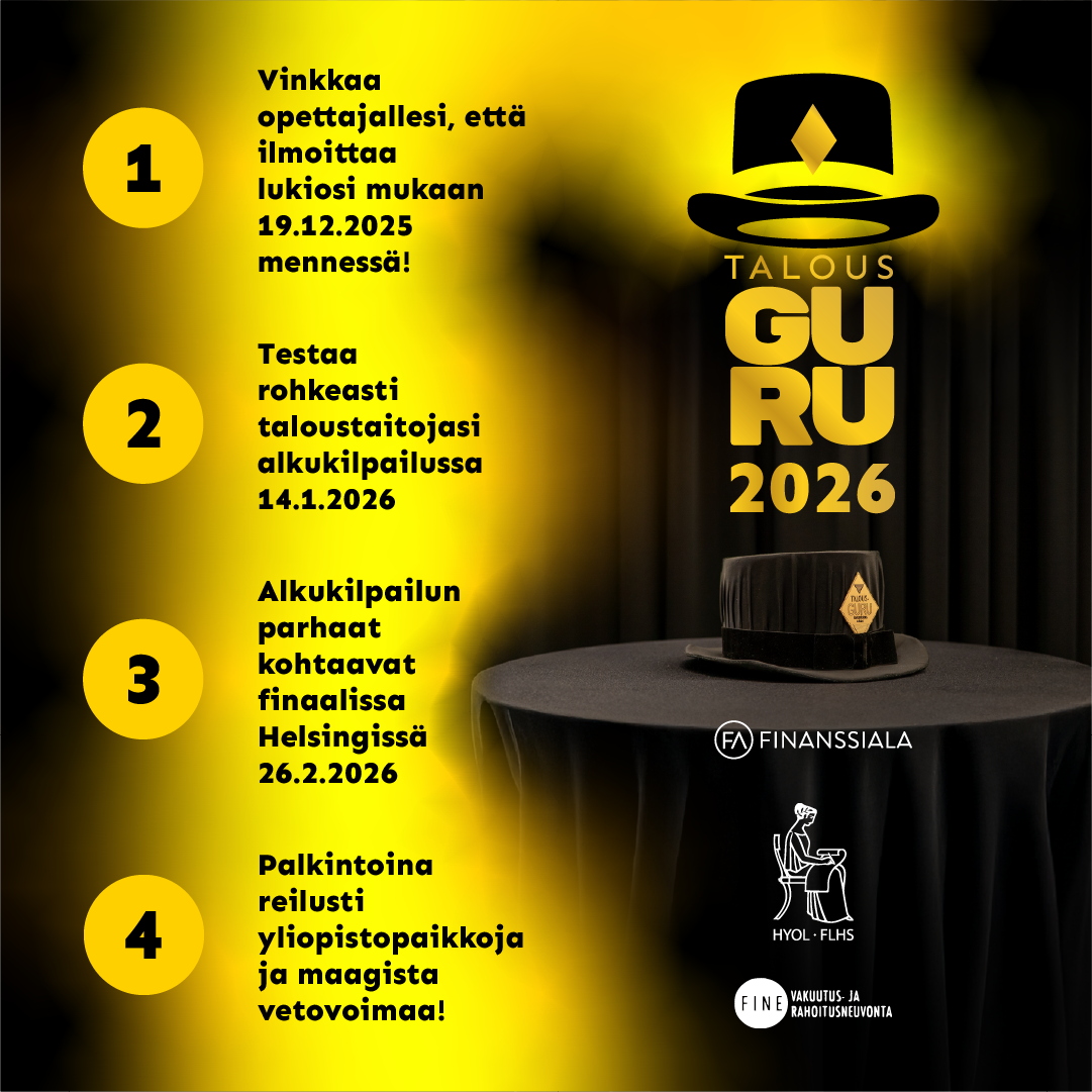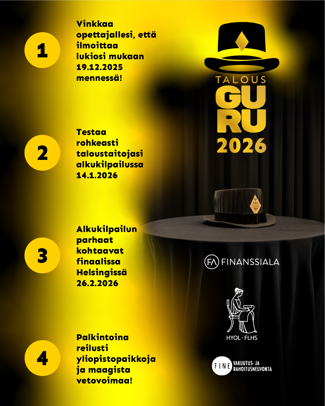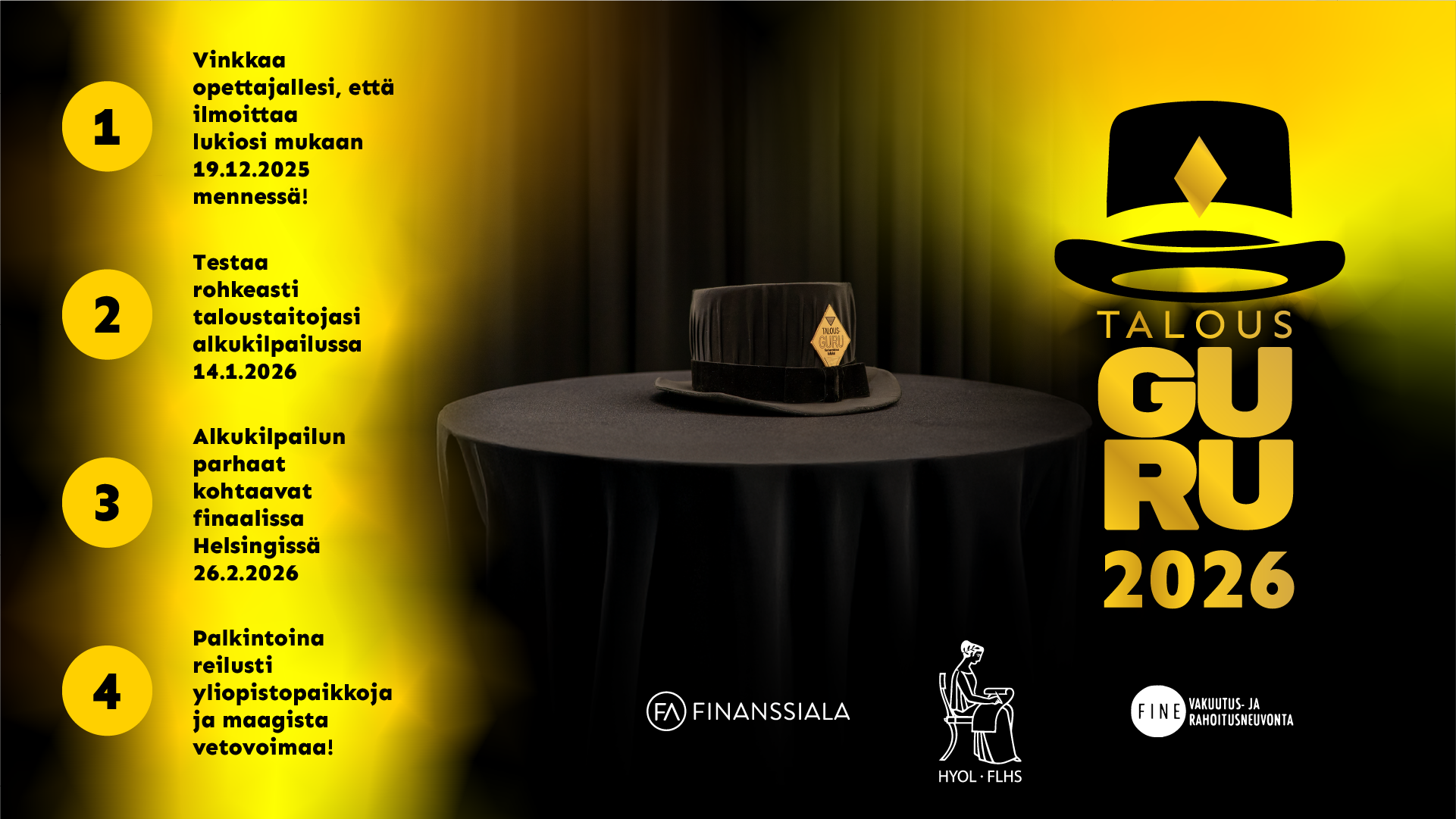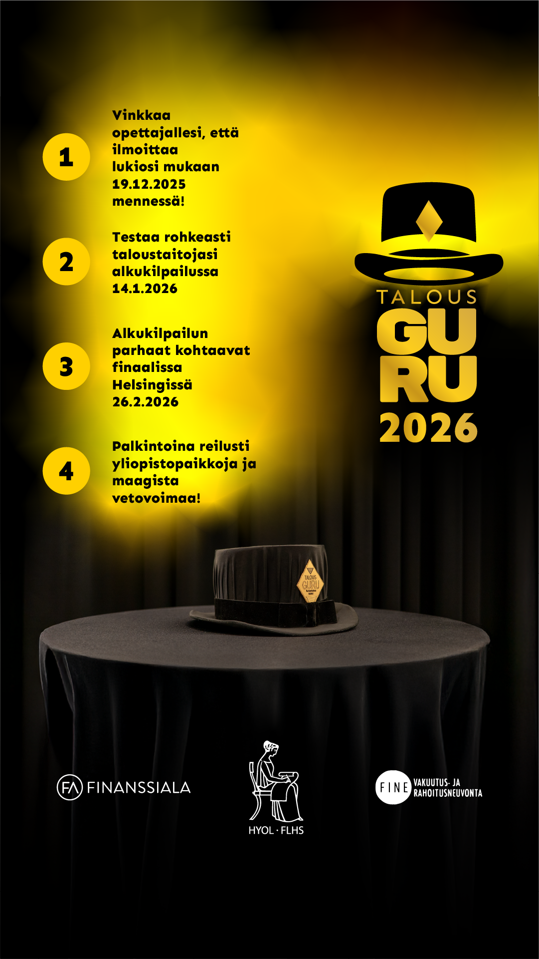 Lataa täältä käyttöösi valmiita tulostuskelpoisia julisteita tai vaikkapa koulusi some-kanavaan sopiva kuva! Voit myös käyttää kuvituksia vapaasti kun kerrot Talousgurusta esityksissä tai esimerkiksi koulun uutiskanavissa.